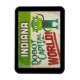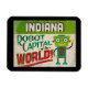 Um charmoso imã de geladeira de viagens vintage de Indiana com um robô engraçado e amigável, junto com um texto divertido no estilo retrô que diz, "Veja você em Indiana"