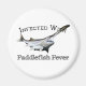 Poucas coisas se comparam a pegar um poderoso peixe-pá. Não é fácil e poucos podem gabar-se. Cor do cheio imagem detalhada de um peixe-espada monstro com o texto Infectado com Febre de Paddlefish.