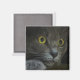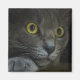 Um tiro na face de um gato cinza com olhos amarelos e pupilas dilatadas, descansando a cabeça sobre a pata e encarando intensamente algo atrás da câmera.