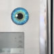 Olho Azul Íris © Marte Solarino Designs. Impresso, legal e divertido, com legal novidade ocular azul, geladeira redonda ou ímã refrigerador, com uma imagem gráfica elegante, moderna, bela, única, assustadora, estranha e retorcida de uma grande íris azul realista de globo ocular de um olho. Outros designs de globo ocular coloridos também estão disponíveis em armazenamento.