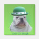 Mostrada é uma imagem fotográfica de um buldogue branco em inglês vestindo uma derbey verde contra uma cobertura verde com o texto, "Erin Go Bragh".
