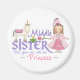 Princesa bonito de rosa com unicórnio e sapo coroado com texto que diz 'Irmã Média'. Tem irmã mais velha e designs irmãs mais pequenas.