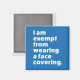 Muitas pessoas estão vestindo máscaras faciais e outros revestimentos para se proteger da COVID-19 e infecções semelhantes; em algumas partes do mundo, há um requisito legal para vestir em certas áreas. No entanto, nem todos podem vestir uma máscara. Algumas pessoas estão isentas por razões de saúde ou outras. Muitas vezes, as crianças beneficiam de isenções. Pessoas com asma, dificuldades respiratórias, ansiedade e muitas outras doenças são também aconselhadas a não vestir máscaras faciais. Esta design pretende tornar isto claro para todos à vossa volta. O texto diz claramente "estou isento de vestir uma cobertura de rosto".