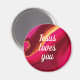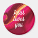 Você pode personalizar este ímã "Jesus ama você" escrito em um moderno e elegante roteiro branco sobre um fundo de uma moderna espiral rosa e laranja. Este botão botânico floral na moda pode ser personalizado com um nome ou outra palavra-chave. Também pode ser encomendado a granel, como é o caso de ocasiões baratas. Seria um presente excelente para truques, travessuras ou sanduíches ou páscoas. Pretende-se encorajar as crianças e os adultos a serem amados pelo seu Pai celestial com um amor eterno. Veja outros designs nesta coleção de expressões cristãs e de ditados religiosos. Excelente de uma igreja cristã ou de senhoras religiosas, presentes na escola de domingo, favores da escola de Bíblia.