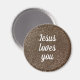 Você pode personalizar este ímã "Jesus ama você" escrito em um moderno e elegante roteiro branco em um fundo falso de ouro brilhante. Este martelo é simulado com muitas manchas douradas pretas. Este botão de tendência de na moda pode ser personalizado com um nome ou outra palavra-chave. Também pode ser encomendado a granel, como é o caso de ocasiões baratas. Seria um presente excelente para truques, travessuras ou sanduíches ou páscoas. Pretende-se encorajar as crianças e os adultos a serem amados pelo seu Pai celestial com um amor eterno. Veja outros designs nesta coleção de expressões cristãs e de ditados religiosos. Excelente de uma igreja cristã ou de senhoras religiosas, presentes na escola de domingo, favores da escola de Bíblia.