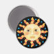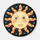 Rosto de sol brincalhão com braços amarelos e laranja tocando bolas de azul e vermelho, em um fundo preto.