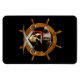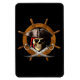 Aargh! Crânio pirata, mancha, chapéu pirata e espadas cruzadas sobre uma antiga roda de madeira.