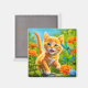 Um gatinho de mesa de laranja giro que franja num jardim floral com libélulas coloridas.