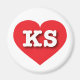 Este ímã apresenta um coração vermelho vibrante contendo as letras maiúsculas, brancas e em negrito KS, a abreviação oficial para o estado do Kansas, o estado do girassol.