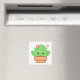 Adorável cacto verde-bebê com um rosto sorridente kawaii fofo, uma flor rosa e amarela e um dentro de coração cor rosa com uma bolha de fala. Ele está sentado em um pote de flores com os braços para abraçar.