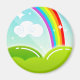 uma ilustração colorida de um arco-íris fofo e nuvem sobre uma paisagem de grama verde.