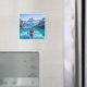 Magnet with an illustration of a man kayaking in the ocean by the snow topped mountains. Pretty serene blue tranquil water and pine trees surround him on a peaceful journey.