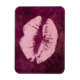 Um ímã com lábios tendenciosos de falso brilho. O fundo é um padrão cor-de-rosa avermelhado escuro com folhas tropicais de palma.