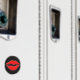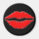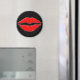 Um ímã redondo com impressão de lábio feminino sobre fundo preto.