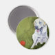 Laboratório amarelo com bola vermelha reproduzida de um óleo original por mim