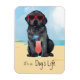 É a vida de um cão! Tenha legal e comemore os dias de verão do cão com este lindo Labrador Negro que veste óculos de sol e relaxa com uma bebida.
