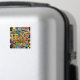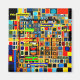 A vibrant geometric pattern, filled with colourful squares and rectangles, is overlaid with an intriguing sentence composed of words in various fonts and colours.