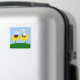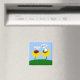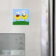 Neste ímã giro, uma abelha desgastada se senta sobre uma flor amarela e pergunta, "Por que você está me incomodando, senhora?", ao qual a joaninha esmagada sentada em outra flor responde, "Bee-Causa você é bonita". Da minha imagem original criada digitalmente.