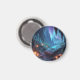 Outside, jagged mountains rise beneath a starry sky, as auroras shimmer in the distance.