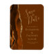 Esta elegante imã salve a data moderna apresenta uma cor de água laranja queimada, borda agitada, aparada com falso brilho dourado. Personalize facilmente o texto dourado sobre um fundo marrom noz.