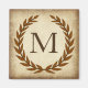 Uma delicada coroa de louros é colocada sobre um fundo de papel antigo no estilo clássico romano. Esta design é personalizada com o monograma "M" em tom siena rico.