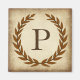 Uma delicada coroa de louros é colocada sobre um fundo de papel antigo no estilo clássico romano. Esta design é personalizada com o monograma "P" em tom siena rico.