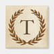 Uma delicada coroa de louros é colocada sobre um fundo de papel pergaminho no estilo clássico romano. Esta design é personalizada com o monograma "T" em tom siena rico.