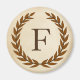 A delicate laurel wreath is layered over a parchment paper background in the classic Roman style. This design is personalized with the monogram "F" in a rich sienna tone.