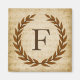 A delicate laurel wreath is layered over a vintage sheet music background in the classic Roman style. This design is personalized with the monogram "F" in a rich sienna tone.