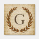 Uma delicada coroa de louros é colocada sobre uma folha de fundo musical antiga no estilo clássico romano. Esta design é personalizada com o monograma "G" em tom siena rico.