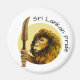 Ilustração aquosa do leão de uma bandeira do Sri Lanka com um homem fluente, representado segurando uma espada estilizada. A expressão do leão é focada, com traços faciais detalhados. A espada tem uma lâmina curvada com designs intrincadas e um punho proeminente. Um fundo circular amarelo destaca a figura, melhorando sua aparência real e emblemática.