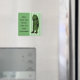 Ímanes divertidos para as pessoas legal da sua vida. À direita do ímã está um pepino verde vestindo tons escuros, um colete preto e botas marrons. Ele está em pé com braços dobrados e um sorriso atrevido. No lado esquerdo, em letras negras, diz-se "Que o seu dia seja tão legal como este pepino". O fundo é verde com listras verdes claras.