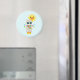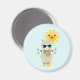 Um ímã com uma lama legal vestindo óculos escuros. Vestido num lenço listrado colorido e botas divertidas. Um sol amarelo brilhante com um rosto kawaii feliz no fundo. Triângulos brancos e coloridos rodeiam esta divertida lhama amorosa. Fundo azul.