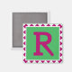 A letra maiúscula 'R' é feita numa cor fuchsia sobre um fundo verde brilhante. A borda pega na cor da fúcsia da letra e tem um design em forma de diamante ao redor da borda em fúcsia e branco.