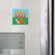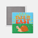 A mensagem do caracol é: calma. Personagem de desenho animado original com texto de rajada de sol e entalhe. Ímanes personalizados. Efeito em relevo aplicado à imagem. Ideia do presente.