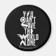 Confira Batman, Cyborg, Aquaman, The Flash, e Mulher Maravilha em pé com as palavras "Você não pode salvar o mundo sozinho" escritas sobre eles. Em cada palavra da frase, uma letra de solteiro é substituída por um logotipo de herói da Liga da Justiça correspondente.