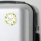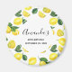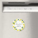 Um ímã de aniversário com um padrão fofo de limões amarelos com folhas verdes e fatias frescas de limão cortado. Um círculo branco colocado sobre o topo com a sua dentro de texto.