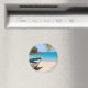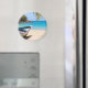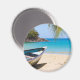 Um ímã com uma cena de praia tropical idílica. Água clara de cristal azul turquesa e uma praia arenosa castanha macia. Algumas folhas de palma penduradas de cima. Um velho barco a remo de madeira fica sentado na praia. Uma paisagem serena e pacífica.