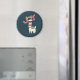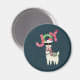 Um imã de natal com um design. Uma lhama bonita vestindo óculos escuros, um chapéu de Papai Noel vermelho e um cachecol festivo de inverno. Também vestindo um cobertor sul-americano chamado "pom-poms". A palavra Joy escrita sobre sua cabeça em uma fonte festiva colorida. Colocado sobre um fundo azul escuro.