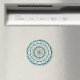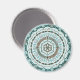 Esta mandala concêntrica apresenta camadas de padrões brancos, turquesas e marrons inspiradas por tecas celtas e capim indiano, como vinhas, fitas e flores de lótus.