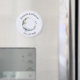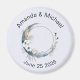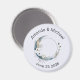 Salve a data / ímã comemorativo com uma ilustração mística. Uma lua crescente azul escura com um contorno circular fino e elegante e flores brancas ao longo de suas bordas.
