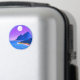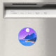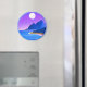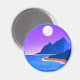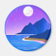 Magnet em ilustração circular de uma lua de cheio, costa marítima, colinas e montanhas em tons de azul profundo e violeta