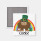 Rua sortuda do Patrick, duende-pé-grande com um arco-íris no fundo