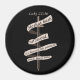 Uma espada com uma fita rolante, com o verso bíblia Luke 22:36 nela. Quem não tem espada, vende o comprar de roupa. O design geral é feito em preto e cinza.