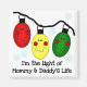 Três bolbos de árvore de Natal com olhos e um sorriso em vermelho, verde e amarelo e texto que diz "Eu sou a luz da Mamãe e da vida do Pai" em sacos de tote de férias, T-shirts, e outros itens para crianças!