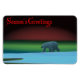 Um urso polar vagueia o gelo durante a longa noite polar; o Norte brilha em vermelho e verde à distância. "Saudações da Estação" também aparece em vermelho.