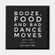 Na moda modernos imã salve o dia para o casal adorável que mal pode esperar para anunciar sua data de casamento para sua família e amigos. Design de tipografia branca e preta que diz: Booze, comida e maus movimentos de dança. Personalize com seus nomes e data do casamento.
