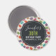 Um ímã de aniversário com um padrão fofo de macarons em muitas cores diferentes com um padrão de bolinhas fraco por trás. Suas informações personalizadas de aniversário escritas em branco dentro de um círculo preto.