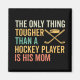 O imã do tema do hóquei para a mãe de hóquei com pinto de hóquei e paus com texto de branco, ouro, aqua e melão que lê A única coisa mais forte que um jogador de hóquei é sua mãe!