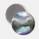 A magnet with a beautiful photo of a scenic landscape. A river rushes through an opening in a lush forest. Rock formations and mountains tower in the background. The sky twinkles with stars and ethereal cosmic looking clouds. I really love this magical landscape image, it gives a sense of awe and wonder at the beauty of nature. It is my pleasure to share it with others, and I hope it brings a little bit of joy to you too.